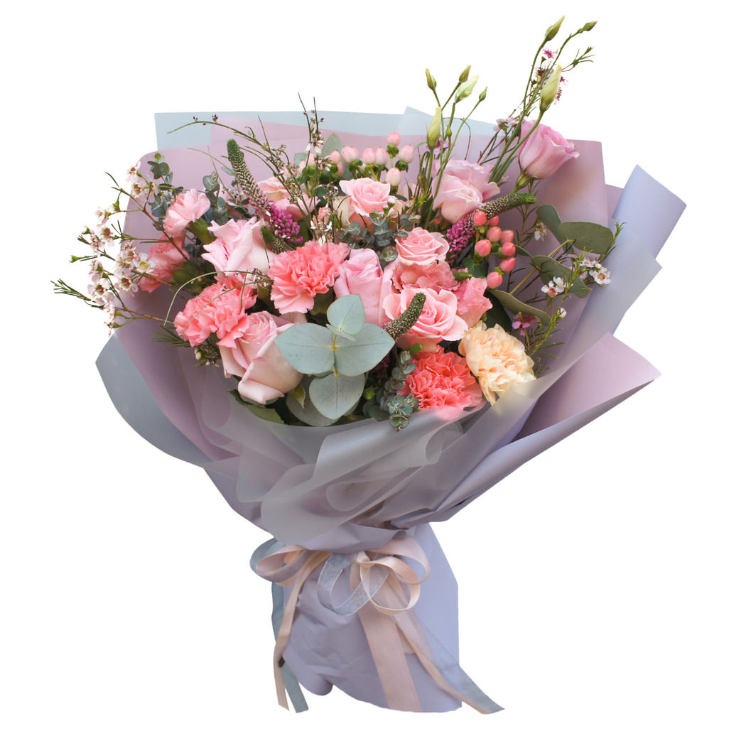 Роза, гвоздика микс, хамелациум, вероника, гиперикум, эвкалипт.